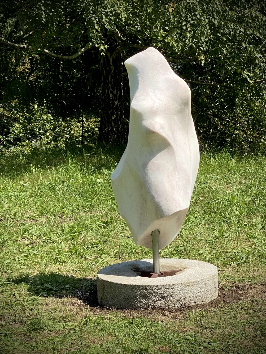 ist eine Figur aus Marmor, die auf einem Mühlstein platziert ist.
