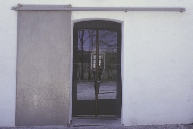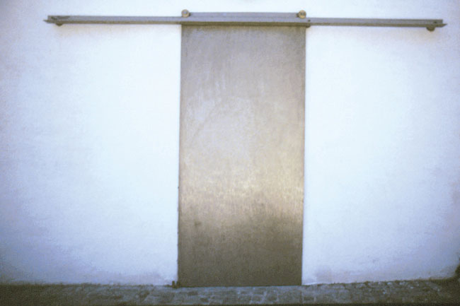 Aussen: Schiebetor, Edelstahl, Bronzerollen Innen: Flügeltür, Edelstahl, Glas