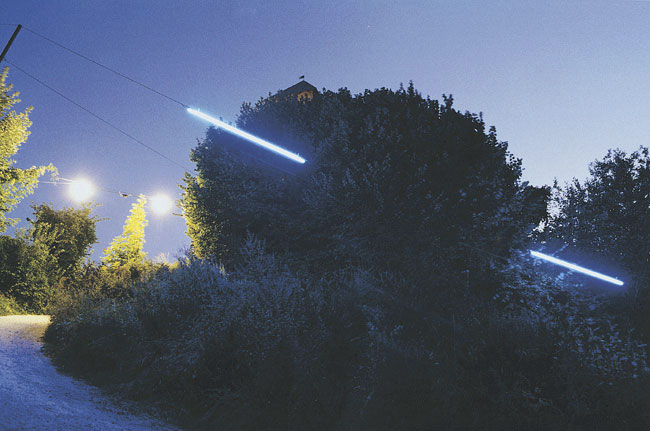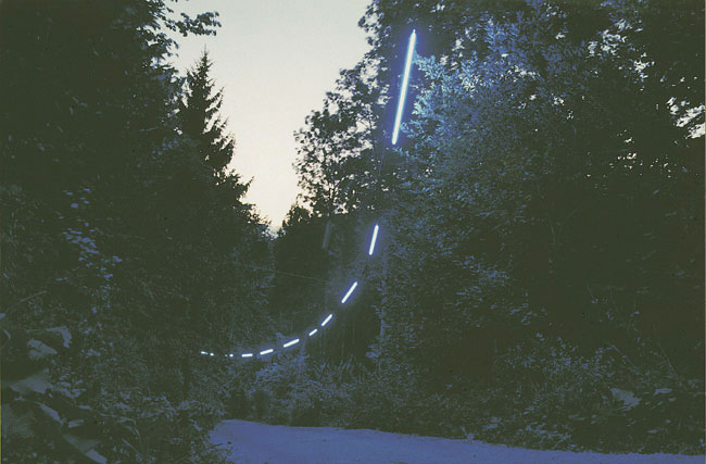 Defaust< bestand aus einem weiten sphärischen Bogen blaues Argon, zweimal den Weg kreuzend - und aus 2 Geraden, die markiert von jeweils 4 Leuchtstoffringen, tangential den großen Bogen am Anfang und am Ende vervollständigten.