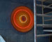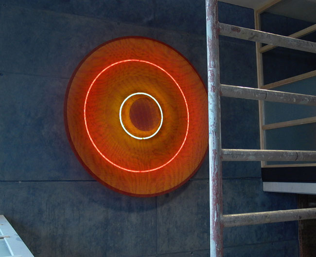 Kreis Durchmesser 2,2 Meter, Edelstahlformrohr bespannt in mehreren Schichten farbiger Gaze, hinterleuchtet mit 2 verschieden farbigen Neonkreisen (1. Durchm. 160 cm, 2 Durchm.65 cm) digital gesteuert mit Schwellern.