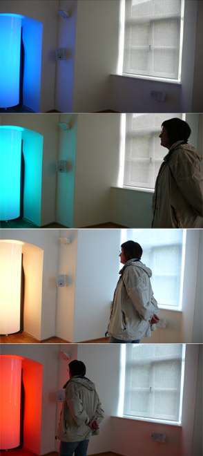 Die Säule steht halb in der Nische der Leseecke, die Fenster sind verdunkelt. 8 Kleinlautsprecher rundum erzeugen den Klangraum.