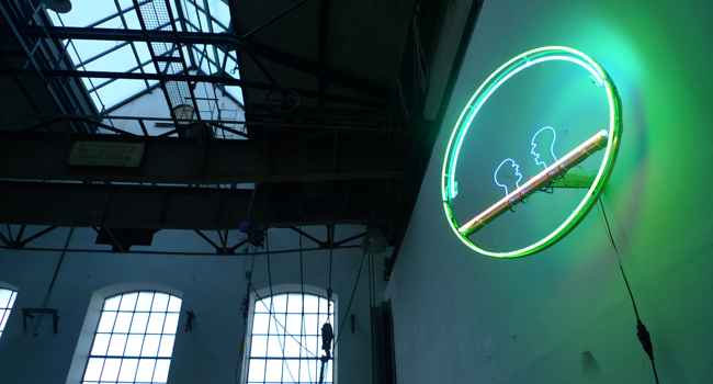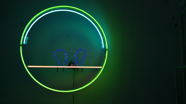 2 sich zugewandte Köpfe (blaues Neon) aus einer Achse wachsend sind in einer kosmischen "Blase" eingeschlossen.