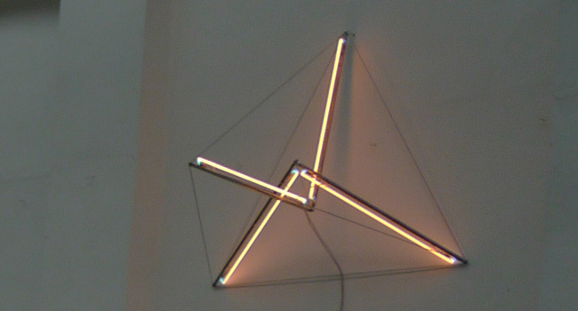 Die Serie "Fragile Tensions" sind Raumkonstruktionen, die Buckminster Fullers Konstruktionsprinzip der fundamentalen statischen Bedingungen innerhalb eines Tragwerks anwenden, um als leichte, schwebende Objekte mit Lichtstäben das Wesen der Doppelnatur des Lichts repräsentieren.