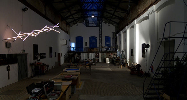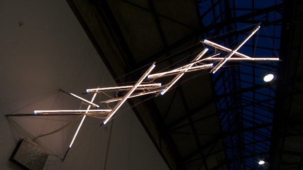 Tensegritykonstruktion mit 12 Neonstäben, 100 x 110 x 360 cm, elektronische Steuerung