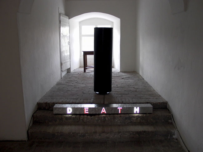 Vier leuchtende Schriftblöcke werden von pulsierenden Gummizylindern begleitet. Die englischen Begriffe haben "Schaltbuchstaben" eingebaut, die einerseits sinnverdrehend oder überhaupt assoziativ disperate Begriffe verknüpfen.