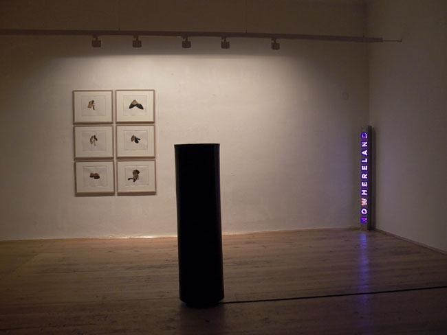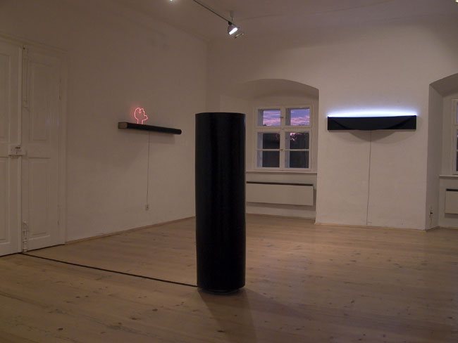 Tomas Hoke installiert Leuchtschriftkästen rund um das Wort. Jeweils ein Buchstabe wird zur Schaltstelle für neuen Sinn und neue Aussage. Maßstäbe, Dimensionen und Begriffe verändern ihre Eindeutigkeit. Licht und Klang bearbeiten das >dazwischen< und dringen dabei "bis in den interstellaren Raum" vor.
