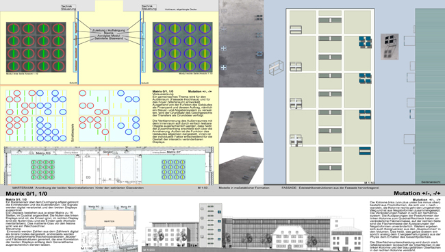 Die Verklammerung des Außenraumes mit dem Innenraum soll durch einfach lesbare Objekte augenscheinlich werden, dass heißt, der Zusammenhang erschließt sich über die Annäherung: Außen ist die Funktion des Gebäudes allgemein dargestellt, innen ist der individuelle Faktor entscheidend für die Gestalt der interaktiv veränderbaren Displays.